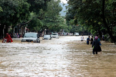 Mưa lớn khiến cho mực nước trên sông Lô dâng cao ngập nhiều tuyến đường ở TP Hà Giang |