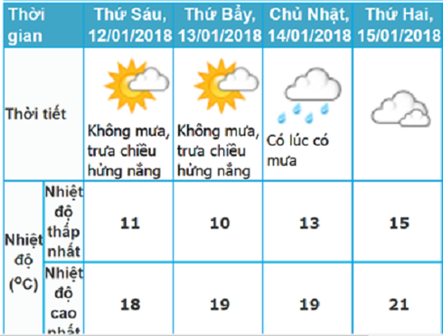 - Ngày mai 13/1 (Thứ 7), Hà Nội trời nhiều mây, không mưa, trưa chiều hửng nắng, trời rét đậm. Nhiệt độ thấp nhất là 10 độ C, nhiệt độ cao nhất là 19 độ C.