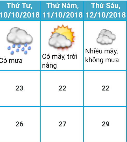 Nhiệt độ trong 2 ngày, 10-12/10 thấp nhất là 24oC, cao nhất là 32oC.