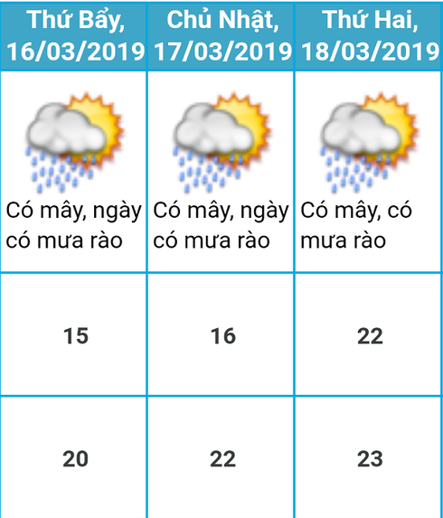 Nhiệt độ trong 3 ngày tới, thấp nhất là 19 độ, cao nhất là 24 độ.