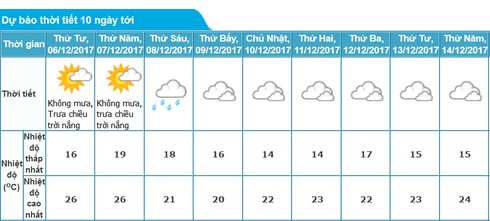 Nhiều mây, không mưa, trưa chiều giảm mây trời nắng. Gió đông bắc cấp 2-3. Sáng sớm và đêm trời rét. Độ ẩm từ 53 - 93%.