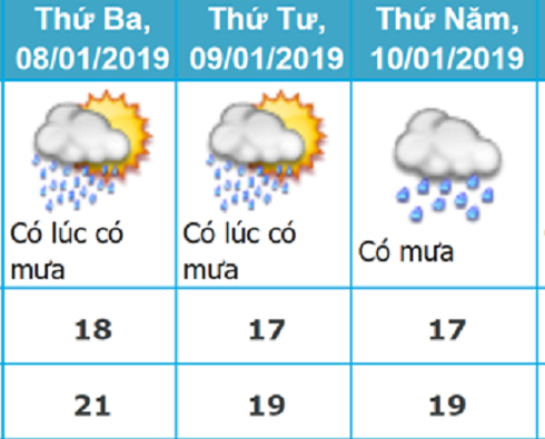 - Khu vực Hà Nội: Từ đêm nay (07/01) đến ngày 10/01 có mưa, mưa rào. Trời rét. Nhiệt độ thấp nhất là 17 độ C