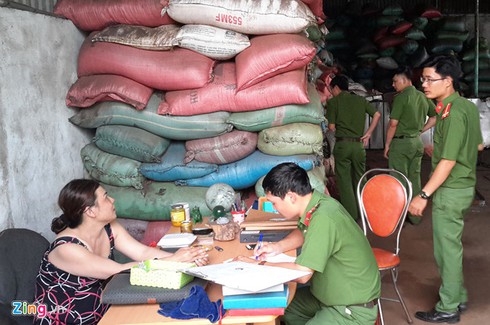 Công an làm việc tại cơ sở trộn phế phẩm cà phê với lõi pin của bà Loan. |