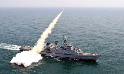 Tàu hộ vệ Masan của hải quân Hàn Quốc phóng tên lửa Harpoontrong một cuộc diễn tập. |