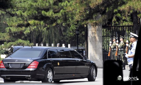 Chiếc xe được cho chởNhà lãnh đạo Triều Tiên Kim Jong-un tiến vàonhà khách quốc gia Điếu Ngư Đài tại thủ đô Bắc Kinh của Trung Quốc vào hôm nay (19/6). |
