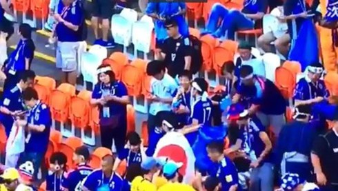 Người hâm mộ bóng đá Nhật Bản dọn rác trên khán đài. |
