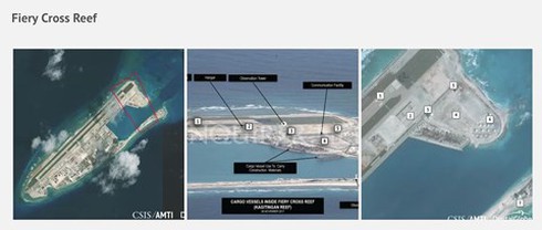Ảnh chụp vệ tinh hoạt động xây dựng trái phép của Trung Quốc trên đá Chữ Thập thuộc quần đảo Trường Sa (thuộc chủ quyền Việt Nam). |