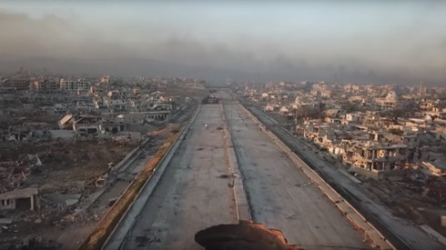 Quang cảnh con đường cao tốc xuyên Đông Ghouta bị tàn phá vì chiến tranh. |
