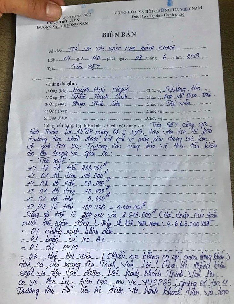 Ngay sau khi nhận được thông báo, anh Lợi đã quay lại xin nhận tài sản của mình. Trưởng tàu SE7 Huỳnh Hữu Nghĩa cùng các bộ phận tiến hành lập biên bản bàn giao toàn bộ số tiền và các vật dụng trên cho Hành khách Trịnh Văn Lợi (mã vé YUSP6S).