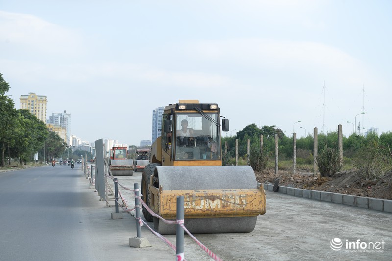 Dọc 2 bên đường gom Đại lộ Thăng Long nhiều máy móc thiết bị được đơn vị thi công sử dụng để gấp rút hoàn thiện nốt những công việc cuối cùng.