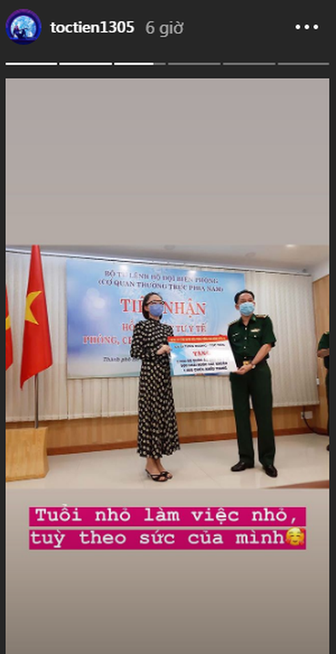 Đáng chú ý giữa lúc cư dân mạng đang khắt khe trong việc "soi xét" chuyện nghệ sĩ ủng hộ nhiều hay ít, Tóc Tiên đã "phủ đầu" ngay khi đăng tải hình ảnh đi làm từ thiện với câu nói: "Tuổi nhỏ làm việc nhỏ, tùy theo sức của mình".