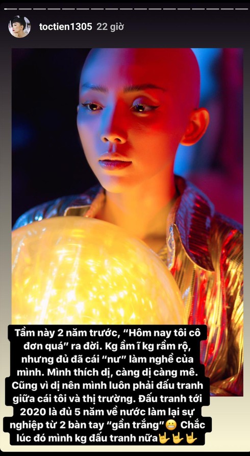 Không chỉ dừng lại ở đó, nữ ca sĩ còn có những chiêm nghiệm về nghề và thị trường âm nhạc hiện nay: “Mình thích dị, càng dị càng mê. Cũng vì dị nên mình luôn phải đấu tranh giữa cái tôi và thị trường. Đấu tranh tới 2020 là đủ 5 năm về nước làm lại sự nghiệp từ hai bàn tay trắng, chắc lúc đó mình sẽ không đấu tranh nữa.”