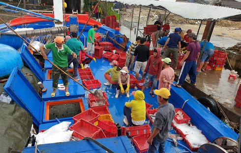 Tàu thuyền tấp nập vào bờ mang theo tôm cá đầy khoang |