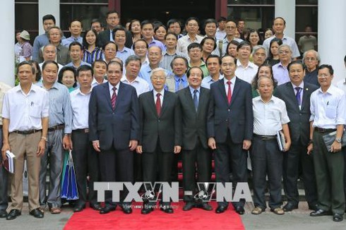Tổng Bí thư Nguyễn Phú Trọng, Chủ tịch nước Trần Đại Quang với các đại biểu tham dự lễ kỷ niệm. Ảnh: Nhan Sáng/TTXVN |