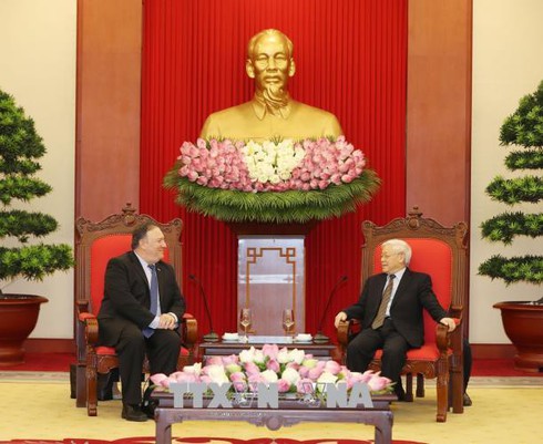 Tổng Bí thư Nguyễn Phú Trọng hoan nghênh và đánh giá cao ý nghĩa chuyến thăm Việt Nam của Ngoại trưởng Mike Pompeo trong bối cảnh hai nước đang có những bước phát triển tốt đẹp trong quan hệ hợp tác nhiều mặt thời gian qua.