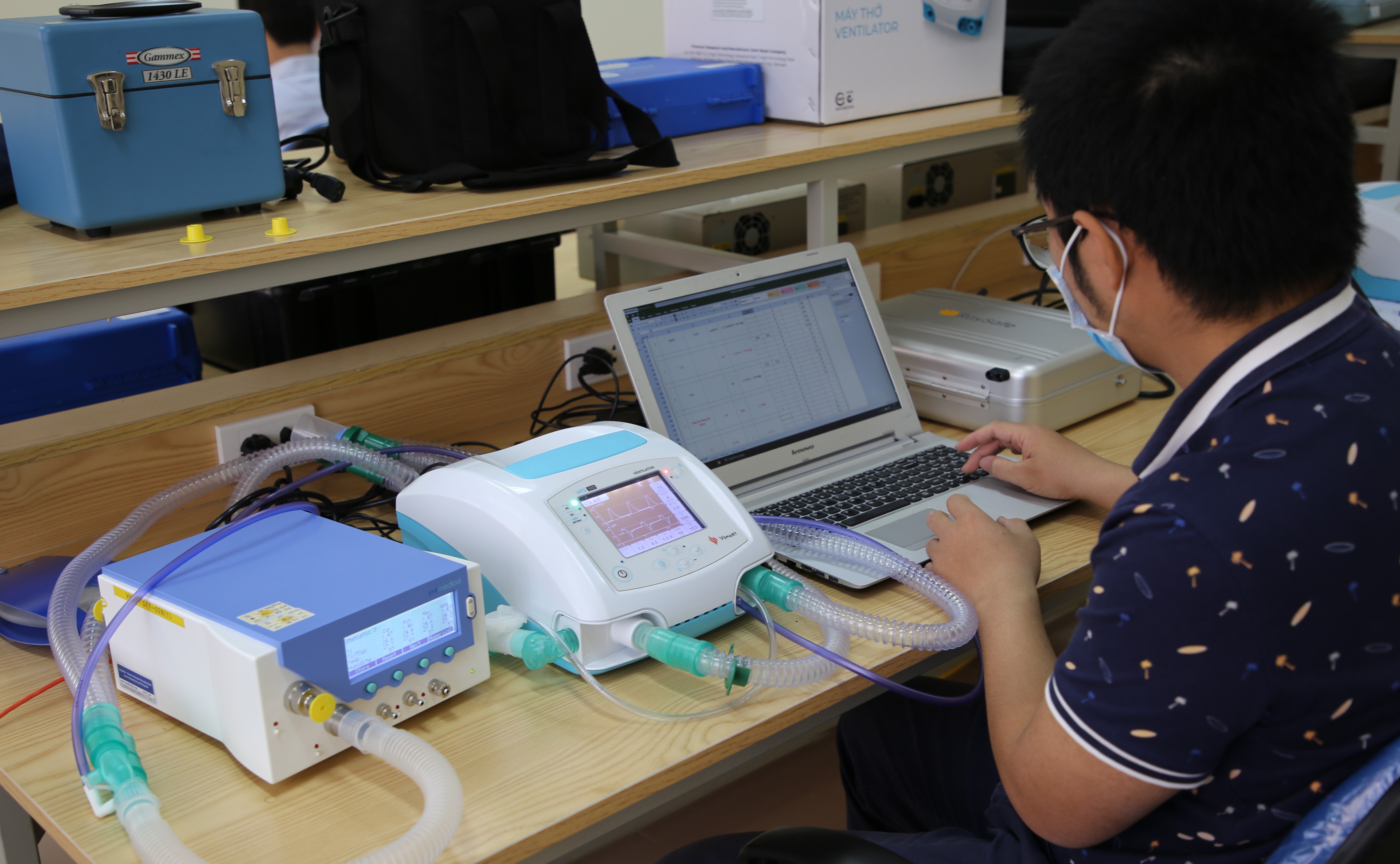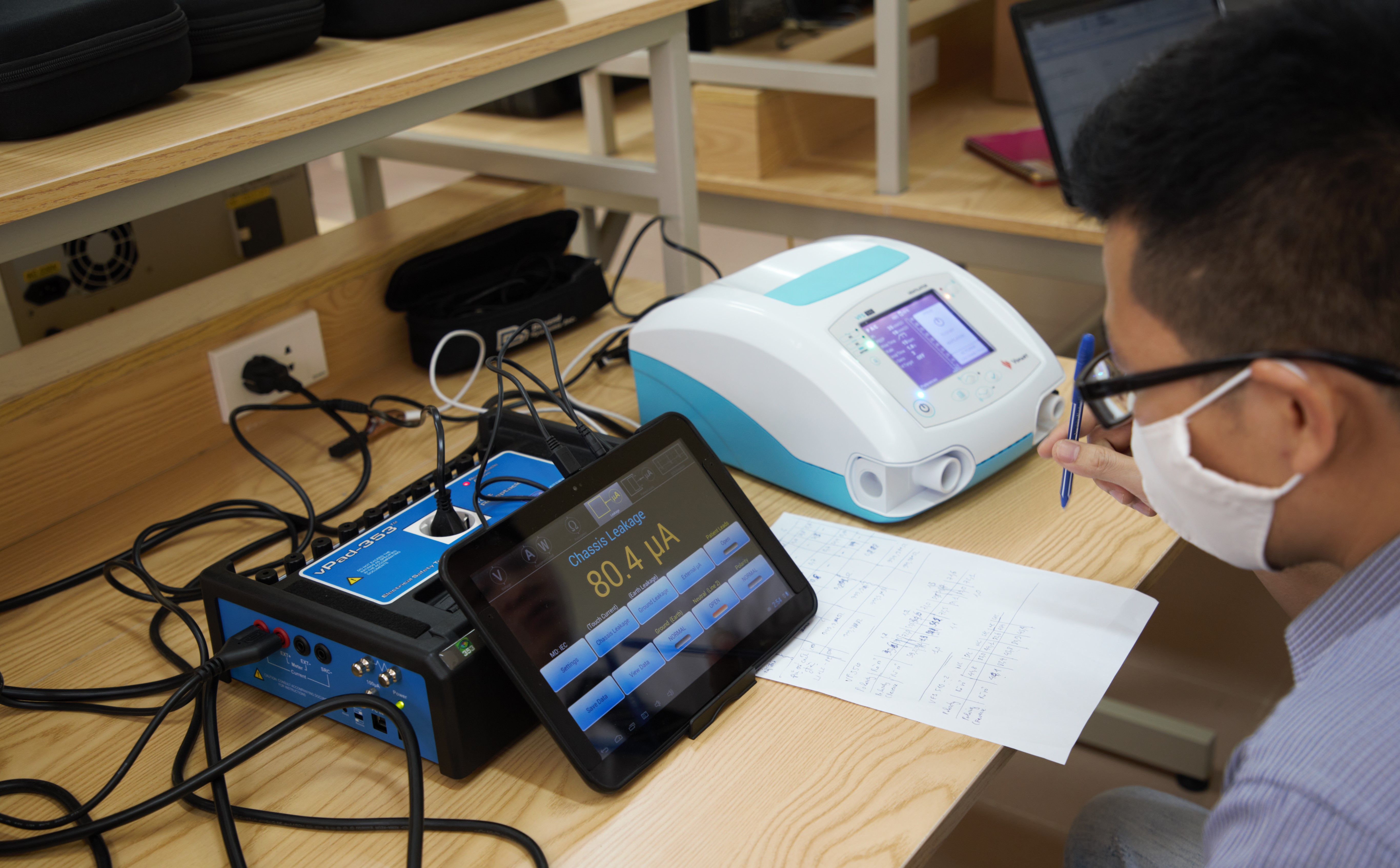 Cán bộ kỹ thuật bộ phận Đo lường Y tế, Viện Đo lường Việt Nam thuộc Tổng cục Tiêu chuẩn Đo lường Chất lượng thực hiện đo lường thử nghiệm cho máy thở VFS-510.