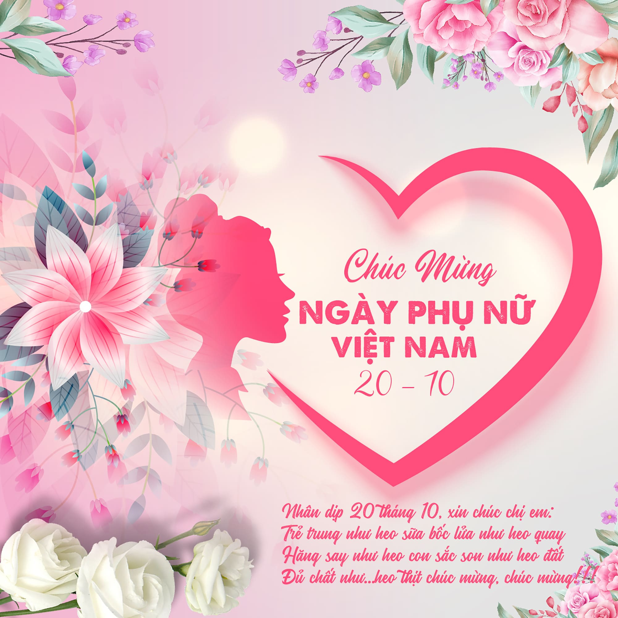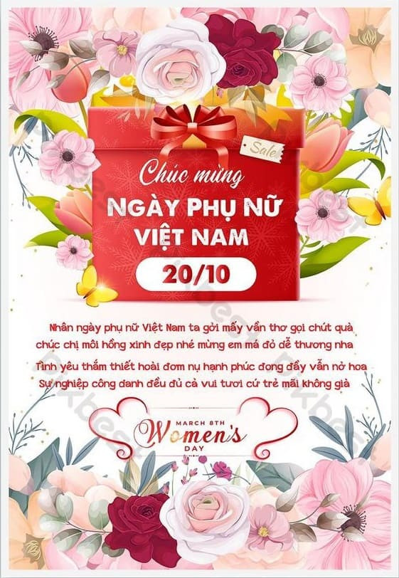Ngày Phụ nữ Việt Nam 20/10 là ngày kỷ niệm, tôn vinh chị em phụ nữ Việt Nam đã có những cống hiến to lớn đối với gia đình và xã hội. Họ là những người mẹ, người chị, người vợ, người bạn, cô giáo hoặc đồng nghiệp thân thiết của chúng ta. Vì vậy, nhân dịp ngày 20/10 này, hãy dành những tình cảm tốt đẹp và yêu thương nhất cho những người phụ nữ thân yêu.