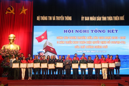 Chiều ngày 15/12, tại TP. Huế (tỉnh Thừa Thiên Huế), Bộ TT&TT phối hợp với UBND tỉnh Thừa Thiên Huế tổ chức Hội nghị Tổng kết công tác tuyên truyền biển, đảo giai đoạn 2013 - 2017 và 3 năm triển khai thực hiện Quyết định số 616/QĐ-TTg ngày 11/5/2015 của Thủ tướng Chính phủ phê duyệt Kế hoạch triển lãm bản đồ và trưng bày tư liệu về chủ quyền của Việt Nam đối với hai quần đảo Hoàng Sa và Trường Sa.
