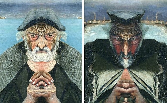 Theo đó, nếu đặt một tấm gương phản chiếu khuôn mặt bên trái, khuôn mặt ông già bỗng trở nên dịu dàng hơn với hai tay chắp lại, phía sau là biển cả hoàn toàn tĩnh lặng. Ngược lại, nếu đặt gương phản chiếu khuôn mặt bên phải, ông lão lập tức trở nên vô cùng đáng sợ với khuôn mặt của quỷ dữ và sóng gió cuộn trào sau lưng.