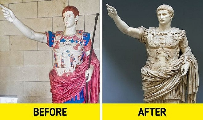 Tuy nhiên, trên thực tế, đây không phải là diện mạo ban đầu của những tác phẩm này. Các nhà nghiên cứu đã tìm thấy dấu vết của màu sơn gốc trên các tác phẩm điêu khắc và tiết lộ sự thật về hình dáng ban đầu của chúng. Nghiên cứu cho biết những bức tượng đơn sắc ngày nay ban đầu được sơn màu sáng. Nhưng trải qua nhiều thế kỷ, màu sơn ban đầu đã bị “đổi màu” bởi thời tiết.
