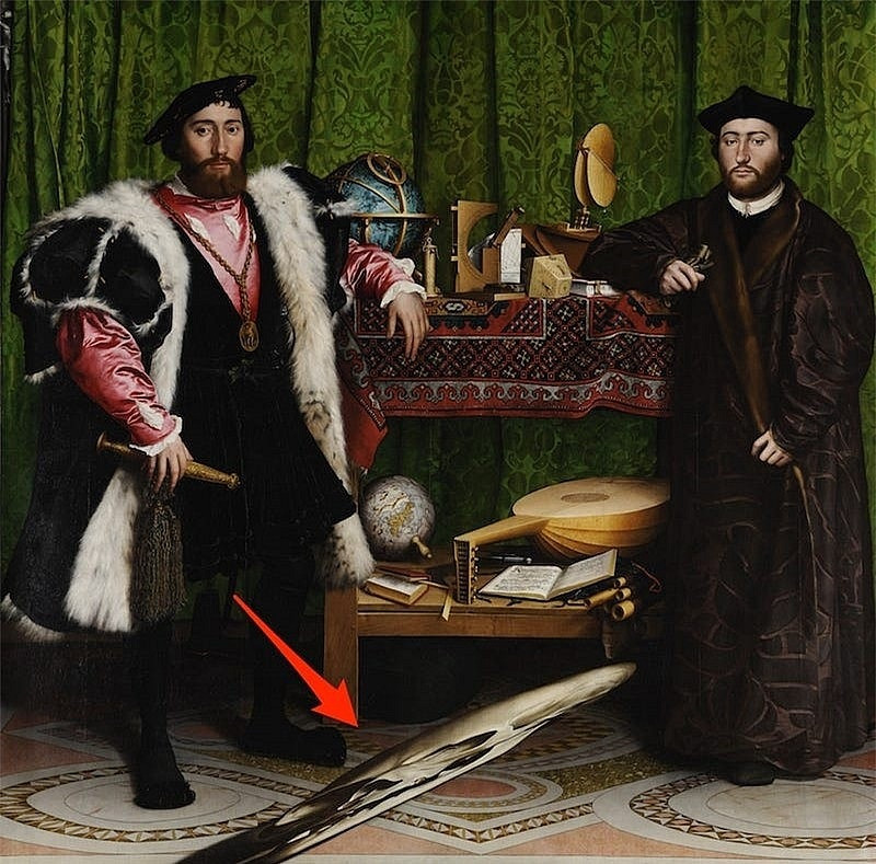 Nếu nhìn từ bên phải, vật thể lạ này có vẻ là một hộp sọ bị biến dạng. Một số người cho rằng hộp sọ là biểu tượng của cụm từ tiếng Latinh "memento mori", có nghĩa là "hãy nhớ rằng bạn sẽ chết".