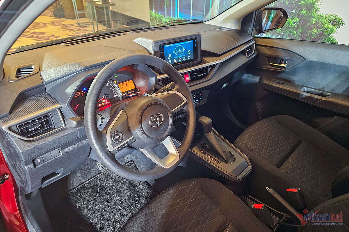 Nội thất của Toyota Wigo 2023 dễ nhìn hơn trước, trang bị dừng lại ở mức cơ bản với màn hình trung tâm 7 inch, điều hòa hiển thị điện tử nhưng vẫn chỉnh tay, vô lăng nhựa và ghế nỉ.