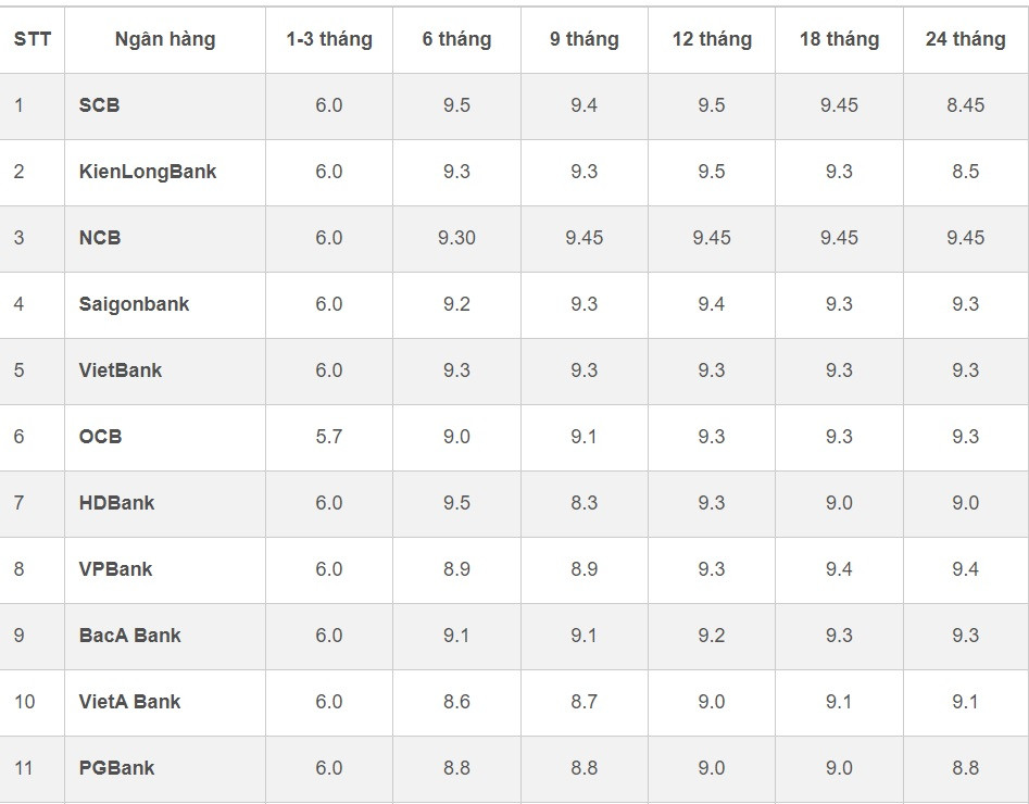 Lãi suất huy động kỳ hạn 9 tháng cao nhất là NCB (9,45%/năm), mức lãi suất này cũng được NCB áp dụng cho các kỳ còn lại. SCB và KienLongBank cũng nằm trong nhóm có lãi suất huy động cao nhất ở kỳ hạn 9 tháng, 9,4%/năm. Tiếp đến là Saigonbank và VietBank cùng áp dụng lãi suất 9,3%/năm.