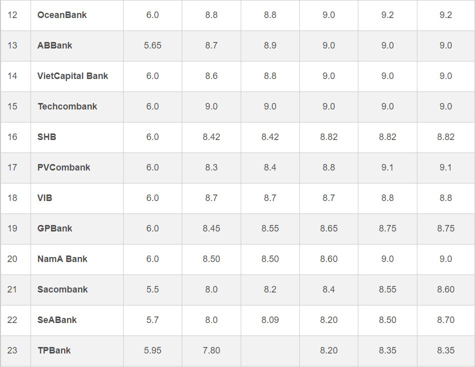 Ở kỳ hạn 12 tháng, kỳ hạn được nhiều người gửi tiền lựa chọn nhất, lãi suất cao nhất vẫn đang thuộc về SCB và KienLongBank với 9,5%/năm. Các ngân hàng NCB, Saigonbank, VietBank, OCB, HDBank, VPBank, và BacA Bank cũng nằm trong nhóm dẫn đầu (từ 9,2-9,45%/năm).
