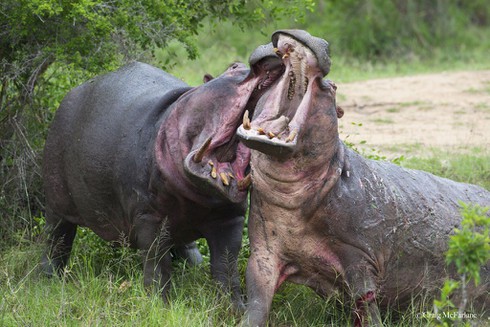 Nếu cảm thấy bị làm phiền, hà mã sẵn sàng tấn công cả sư tử lẫn cá sấu. Sở hữu cơ thể "cồng kềnh", hà mã vẫn dễ dàng đạt vận tốc 32 km/h khi truy đuổi kẻ thù. Ảnh: Pinterest.