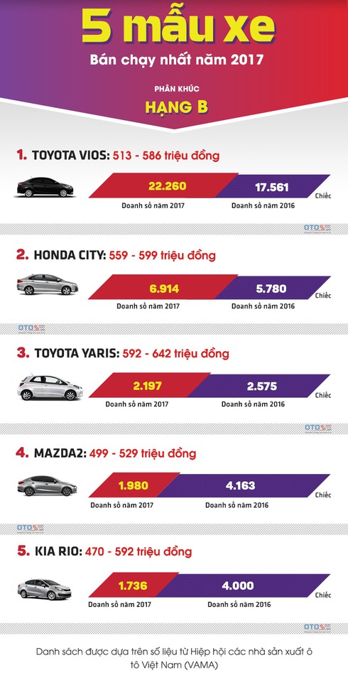 Top 5 mẫu xe tầm trung bán chạy nhất Việt Nam năm 2017. (Nguồn: OtoS.vn) |