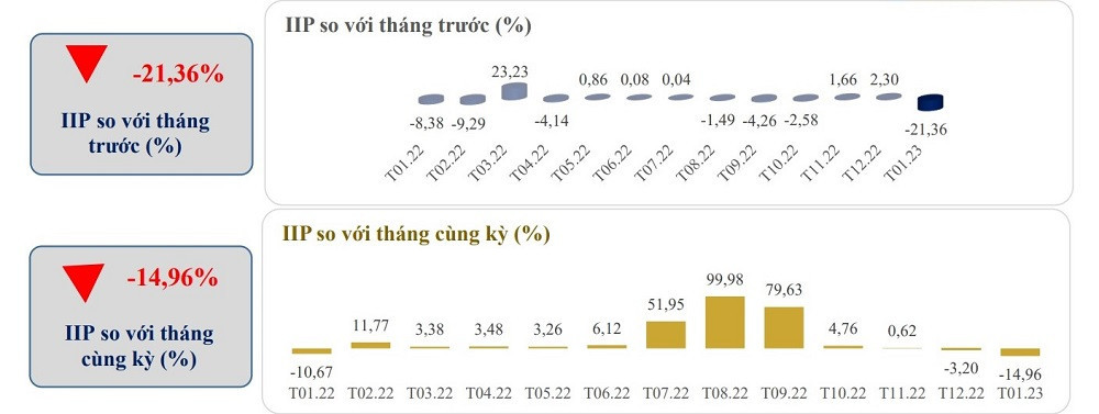 Trong khi đó, số liệu của Cục Thống kế TP.HCM cho thấy, chỉ số sản xuất công nghiệp (IIP) tháng 1/2023 giảm 21,36% so với tháng trước và giảm 14,96% so với cùng kỳ. Đồng thời, chỉ số tồn kho tăng 6,6%.