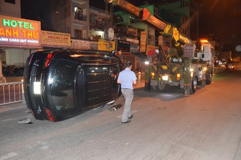 Cách đó khoảng 30m, một ô tô 4 chỗ mang BKS: 51F – 101.78, do nam tài xế khoảng 40 tuổi điều khiển, khi tới ngã tư đường Nguyễn Thái Sơn (quận Gò Vấp) thì bất ngờ tông mạnh vào dải phân cách bằng sắt ngăn giữa hai hướng rồi lật ngang. Tài xế may mắn thoát chết vì có túi khí tự bung.