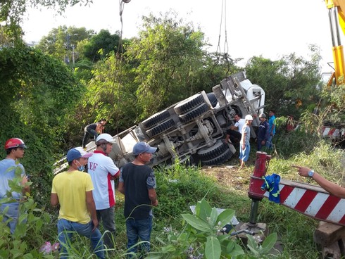 Lúc này, tài xế xe bồn đột ngột bẻ lái qua trái khiến chiếc xe lao xuống mương rồi lật nhào.