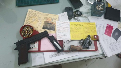 Công an còn thu giữ tang vật là 1 xe ô tô, 2 khẩu súng gồm bắn đạn chì và bắn đạn bi, 30 viên đạn dạng thể thao quốc phòng, 17 viên bi sắt…