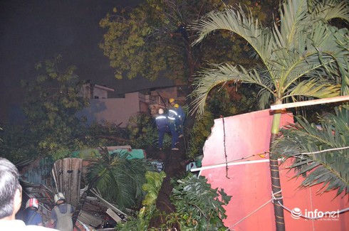 Tại hiện trường, 2 căn nhà bị thân cây đè sập hoàn toàn, nhiều đồ đạc, xe máy bị vùi trong đống xà bần, toàn bộ khu vực bị mất điện.