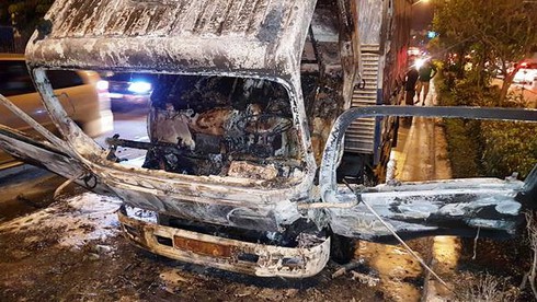 Chiếc xe tải bị cháy rụi, nham nhở toàn bộ cabin xe |