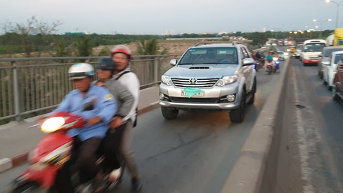Một chiếc xe con che biển số đã chạy cả vào làn xe máy trên cầu Phú Mỹ. |
