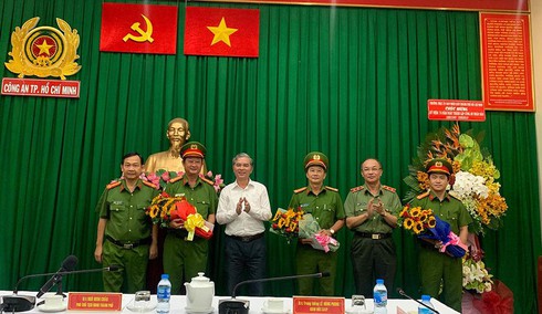 Ông Ngô Minh Châu, Phó Chủ tịch UBND.TP và Trung tướng Lê Đông Phong, Giám đốc Công an TP.HCM khen thưởng các đơn vị tham gia chuyên án. |