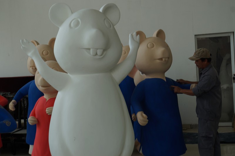 Những người công nhân tỷ mỉ tạo hình và sơn màu để hoàn thành tác phẩm. Theo những người thợ làm việc tại đây, khó nhất là thể hiện được "thần thái" của các chú chuột khi chuyển từ hình vẽ sang hình khối, làm sao để người xem thấy được cả nét tinh nghịch, láu cá, và sự thân thiện của họ hàng "nhà Tý". |