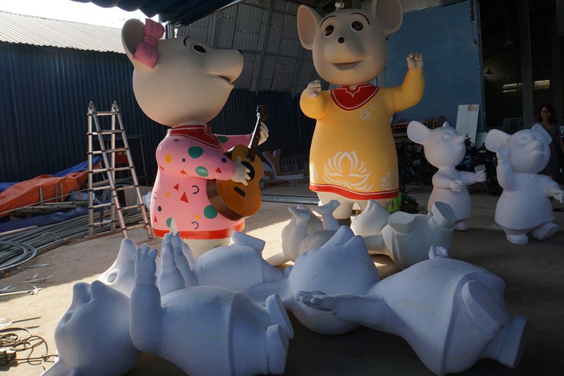 "Linh hồn" của đường hoa Nguyễn Huệ Tết Canh Tý 2020 là cảnh gia đình chuột đang nhảy múa, trong đó "nhạc trưởng" chuột bố cao 3 mét chỉ huy đội nhạc công gồm: chuột mẹ cao 2,5 mét và bảy nhạc công chuột nhí cao trung bình 1,5 mét đàn hát xung quanh. Hiện đôi chuột "bố mẹ" đã hoàn thiện màu sắc như thiết kế, trong khi "đàn con" đang chờ sơn lớp màu cuối cùng. |