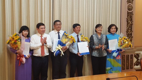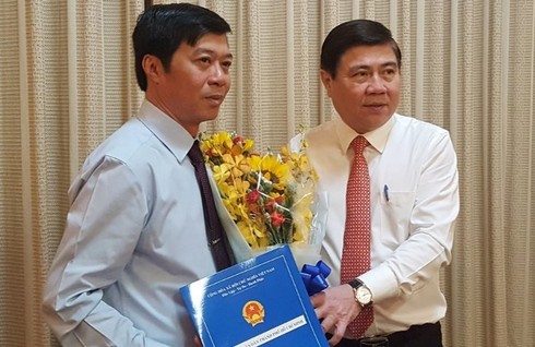 Chủ tịch UBND TP.HCM Nguyễn Thành Phong (phải) trao quyết định bổ nhiệm cho ông Trần Tuấn Ngọc. |
