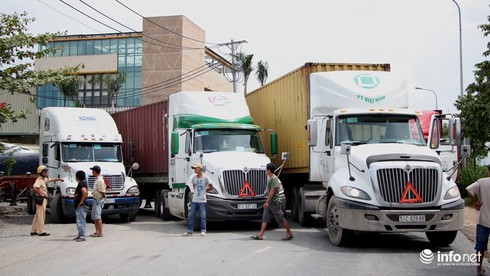 3 xe container tranh đường đi khiến các xe phía sau kẹt một đoạn dài trước khi vào vòng xoay Mỹ Thủy. |