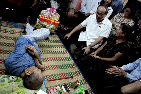Bí thư Thành ủy Nguyễn Thiện Nhân trong lần đến thăm một hộ dân di dời để xây dựng khu đô thị Thủ Thiêm. |
