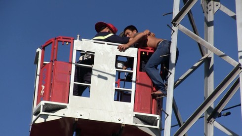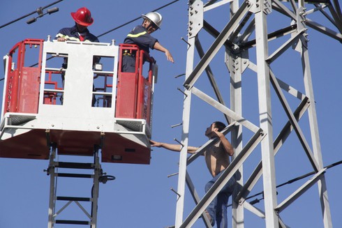 Sau 5 giờ thuyết phục, lực lượng cứu hộ cứu nạn đã đưa nam thanh niên xuống đất an toàn |