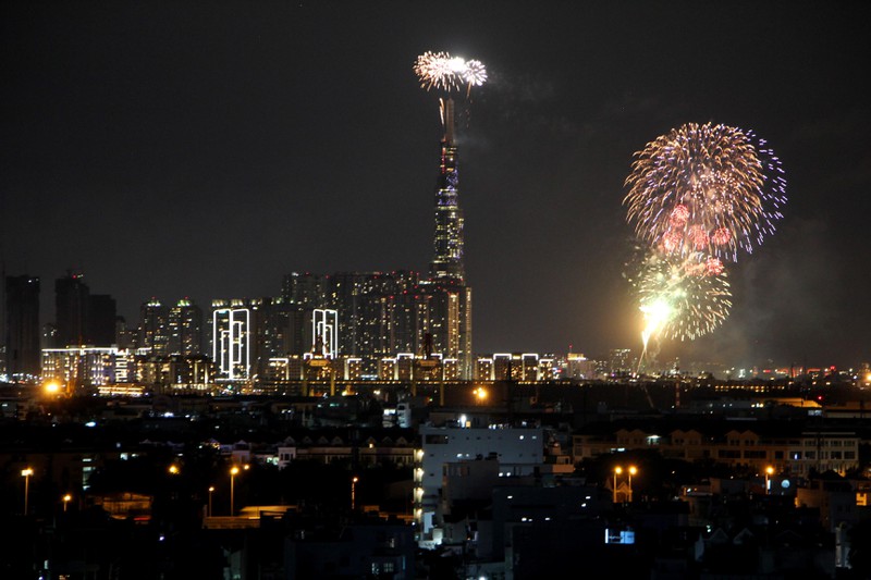 Pháo hoa tại đầu hầm Thủ Thiêm. Trước khi có tại Landmark 81, đây thường là vị trí duy nhất bắn pháo hoa tầm cao trong các dịp kỷ niệm.