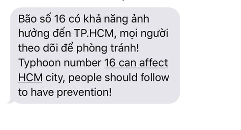 Cụ thể, nội dung tin nhắn qua điện thoại người dân nhận được là “Bão số 16 có khả năng ảnh hưởng đến TP.HCM, mọi người theo dõi để phòng tránh!”. Tiếp sau đó là dòng cảnh báo bằng tiếng Anh “Typhoon number 16 can affect HCM city, people should follow to have prevention!”.