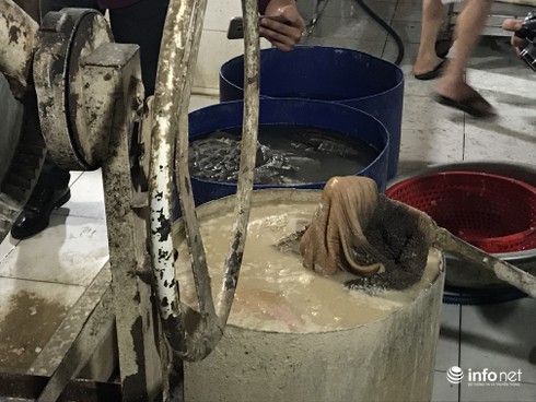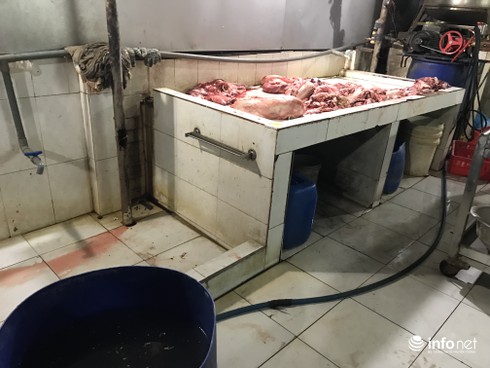 Tại thời điểm kiểm tra, đoàn phát hiện 3 thùng nhựa lớn đựng sách bò đen thui, bốc mùi thum thủm được ngâm trong nước trắng đục cùng một máy trộn bê tông loại nhỏ được cắm điện sẵn bên cạnh; hàng chục kg cuống bò, tim bò, lòng bò bày trên nền dụng cụ cáu bẩn; nhiều chân bò chưa cạo sạch lông nằm tênh hênh trên nền nhà dơ bẩn. Kiểm tra tủ đông, đoàn phát hiện nhiều kg phổi, gan bò chảy dịch, bốc mùi hôi.