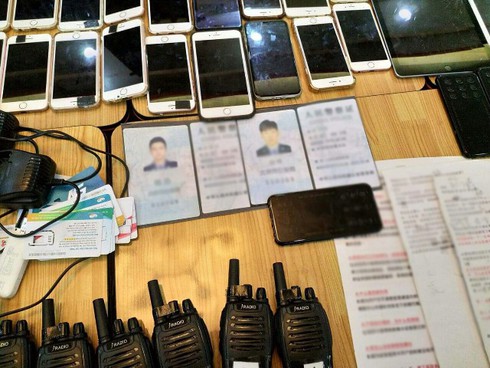 Cụ thể công an đã thu giữ 221 tờ tài liệu, 19 cuốn tập A4 chứa nội dung kịch bản giả danh Công an Trung Quốc để lừa đảo, 02 bản sao chụp (in màu) giả mạo giấy chứng nhận Công an Trung Quốc, 26 máy tính bảng Ipad, 46 điện thoại di động, 06 máy tính xách tay hiệu Lenovo, 03 thiết bị giả lập âm thanh môi trường (còi hiệu, tiếng súng, nhạc lễ quân cảnh, tiếng ồn văn phòng, tiếng cười nói...), 05 bộ phát 4G wifi, 03 USB, 04 thiết bị D-Com 4G, 03 ổ cứng máy tính, 08 bộ đàm liên lạc và 01 máy in phun màu.