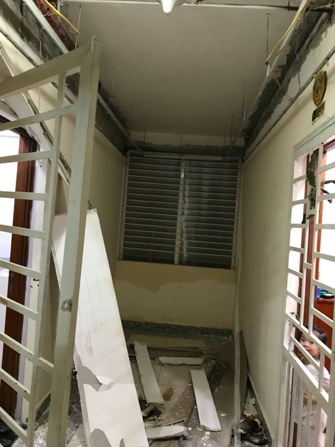 Phần trần thạch cao bị đổ sập vốn được thiết kế để tạo thẩm mỹ và che hệ thống đường ống, dây điện nằm sát với trần bê tông ở lối đi |