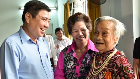 Chủ tịch UBND TP.HCM Nguyễn Thành Phong thăm Mẹ Việt Nam anh hùng Lương Thị Lộc vào ngày 25/7. |